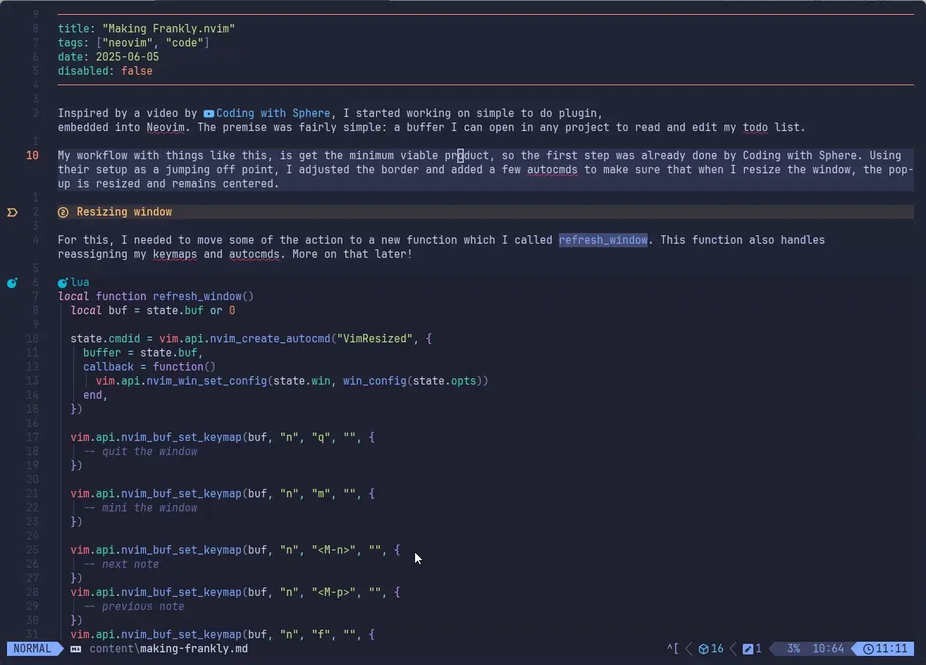 My workflow with things like this, is get the minimum viable product, so the first step was already done by Coding with Sphere. Using their setup as a jumping off point, I adjusted the border and added a few autocmds to make sure that when I resize the window, the pop-up is resized and remains centered.
